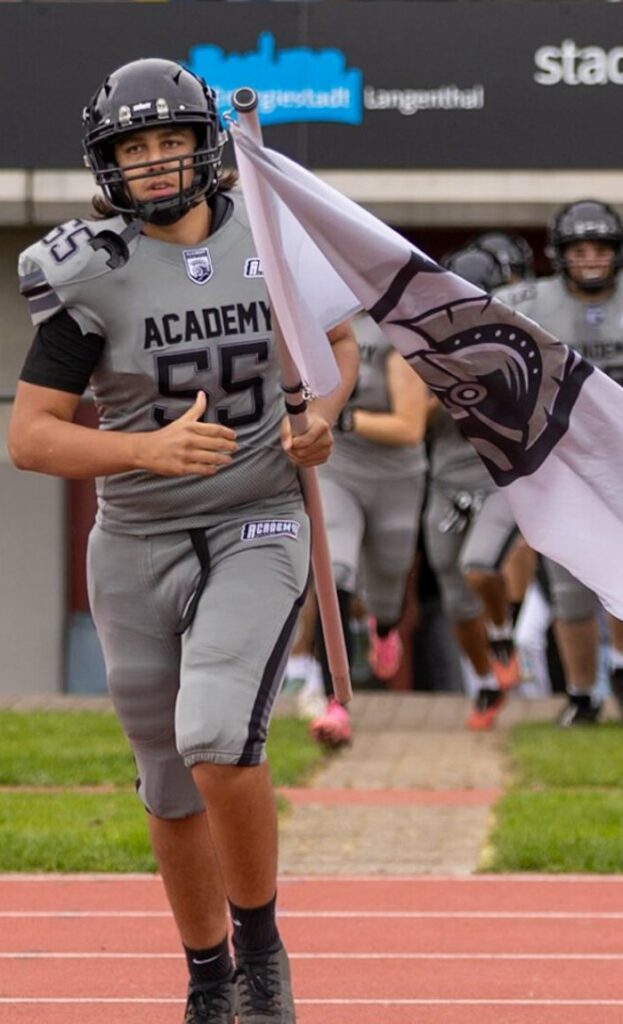 Enis ist bereits seit 2022 in unserem Verein, und spielte zuerst noch Receiver. Nachdem es im ersten Jahr hauptsächlich darum ging Erfahrungen zu sammeln – für Enis und für uns als Verein 😊 – wechselte er aufgrund seines Jahrgangs als einziger aus seinem Freundeskreis bereits 2023 in die U16. Und hier kam dann auch sein erster grosser Entwicklungsschritt. Er verbesserte seine Wurf- und Fangfähigkeiten, er lernte das Spiel zu lesen und zu verstehen, und lernte Entscheidungen schneller zu treffen. Vor allem aber machte er einen grossen körperlichen Sprung. Und hiermit ist nicht nur die Grösse gemeint, sondern vor allem begann Enis auch bewusster an seinem Körper zu arbeiten. Diese Entwicklungen führten dazu, dass Enis zur letzten Flag Saison auf die Quarterback Position wechselte. Hier hat er unser U16 Red Team mit zahlreichen präzisen und kraftvollen Würfen zu 6 Saisonsiegen geführt.